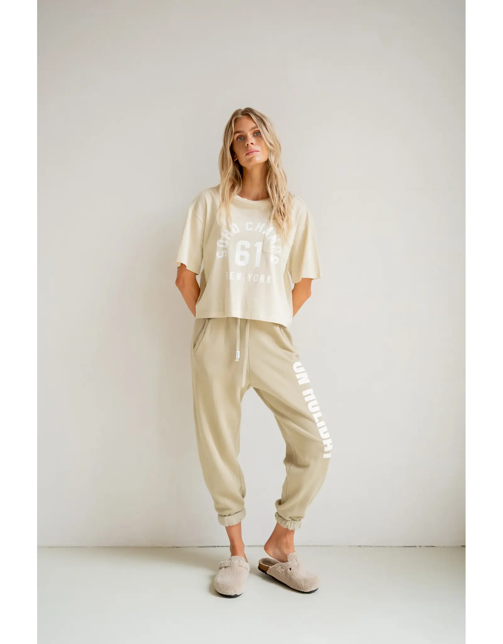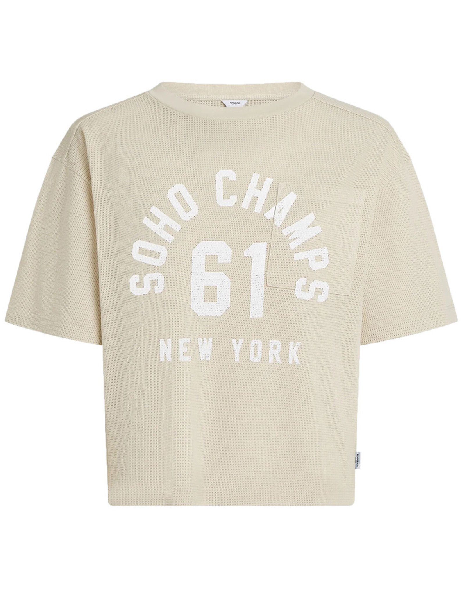 A sporty essential with a relaxed, modern feel. This lightweight T-shirt features a breathable textured fabric and a bold varsity-inspired print, combining casual comfort with an effortless statement look. Perfect for everyday wear with a contemporary edge.