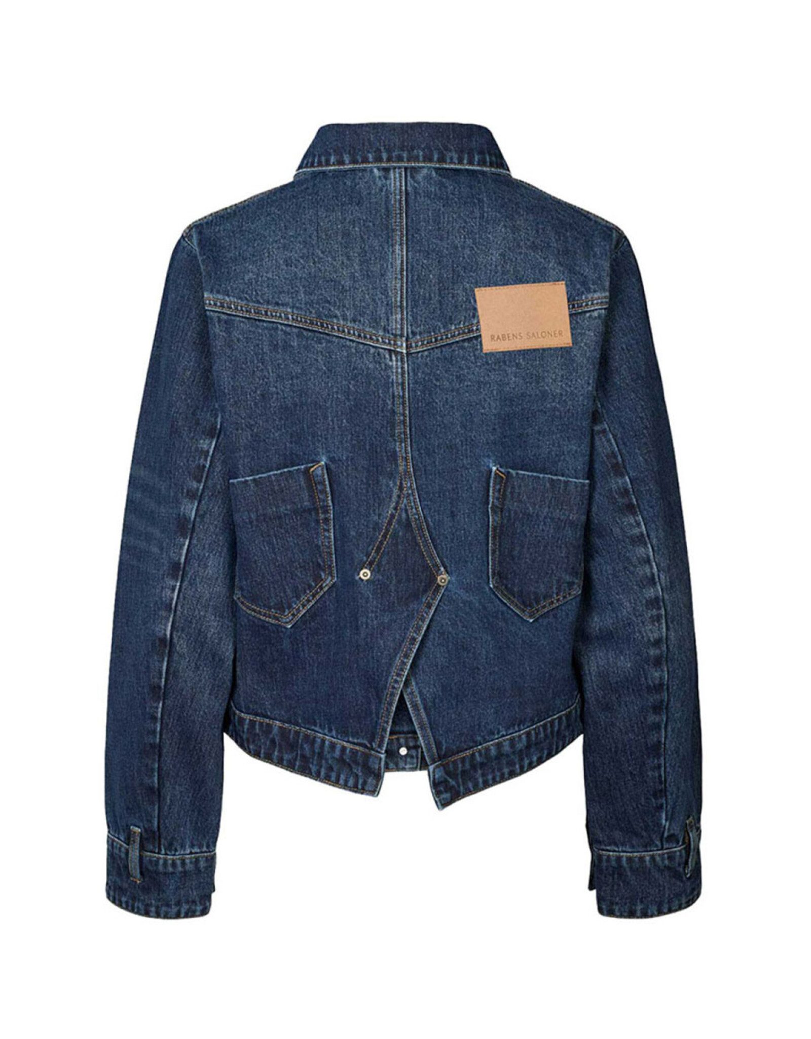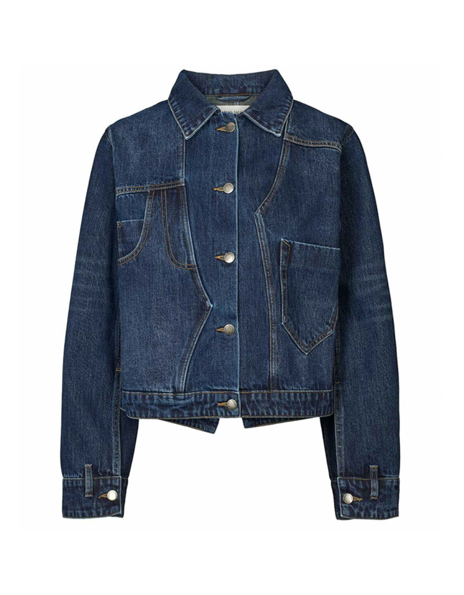 De jas is voorzien van een klassieke kraag, een knoopsluiting aan de voorkant en opvallende contraststiksels die het denim karakter benadrukken. De verschillende opgestikte zakken zorgen voor een speels detail en geven het jasje een stoere, casual look.