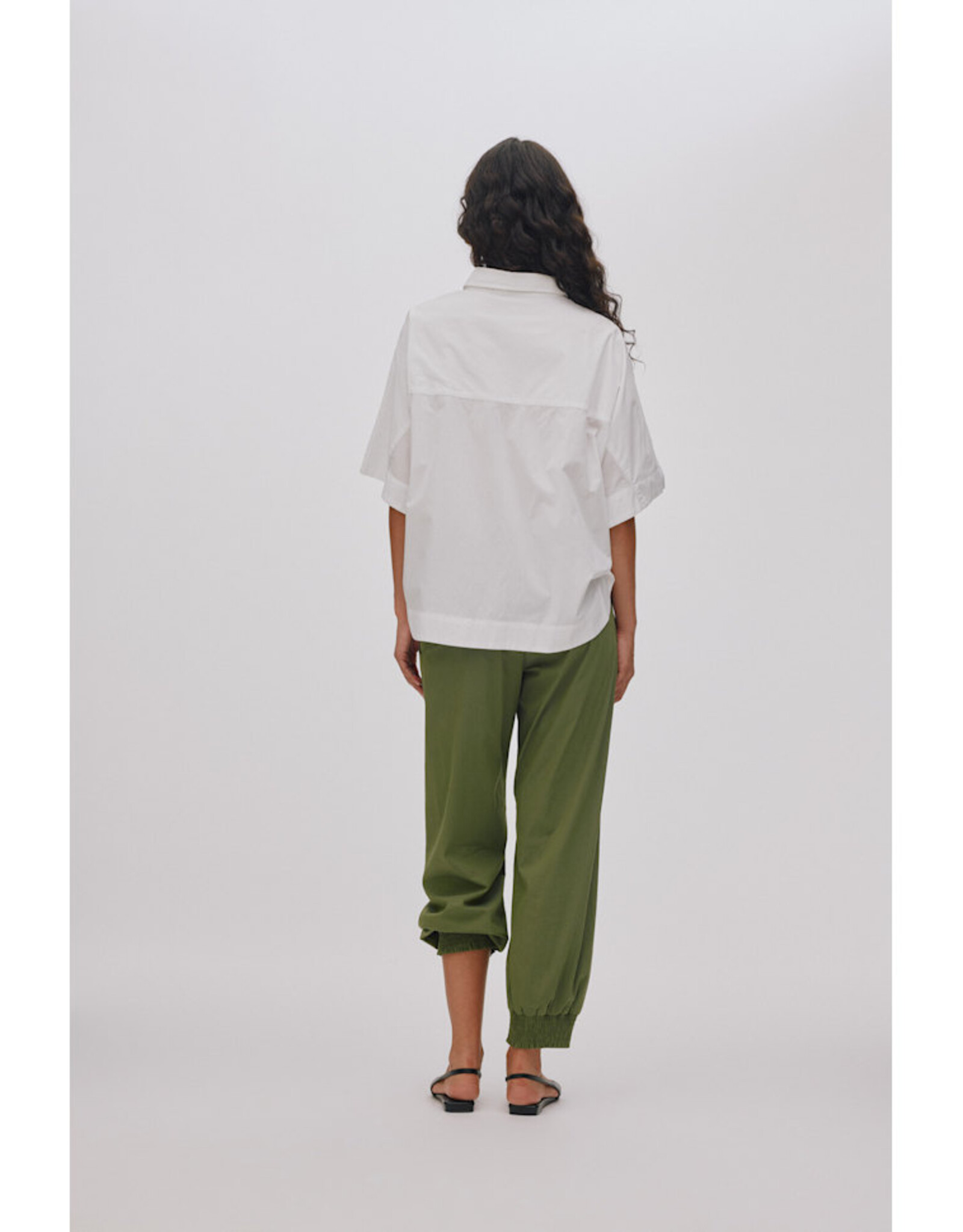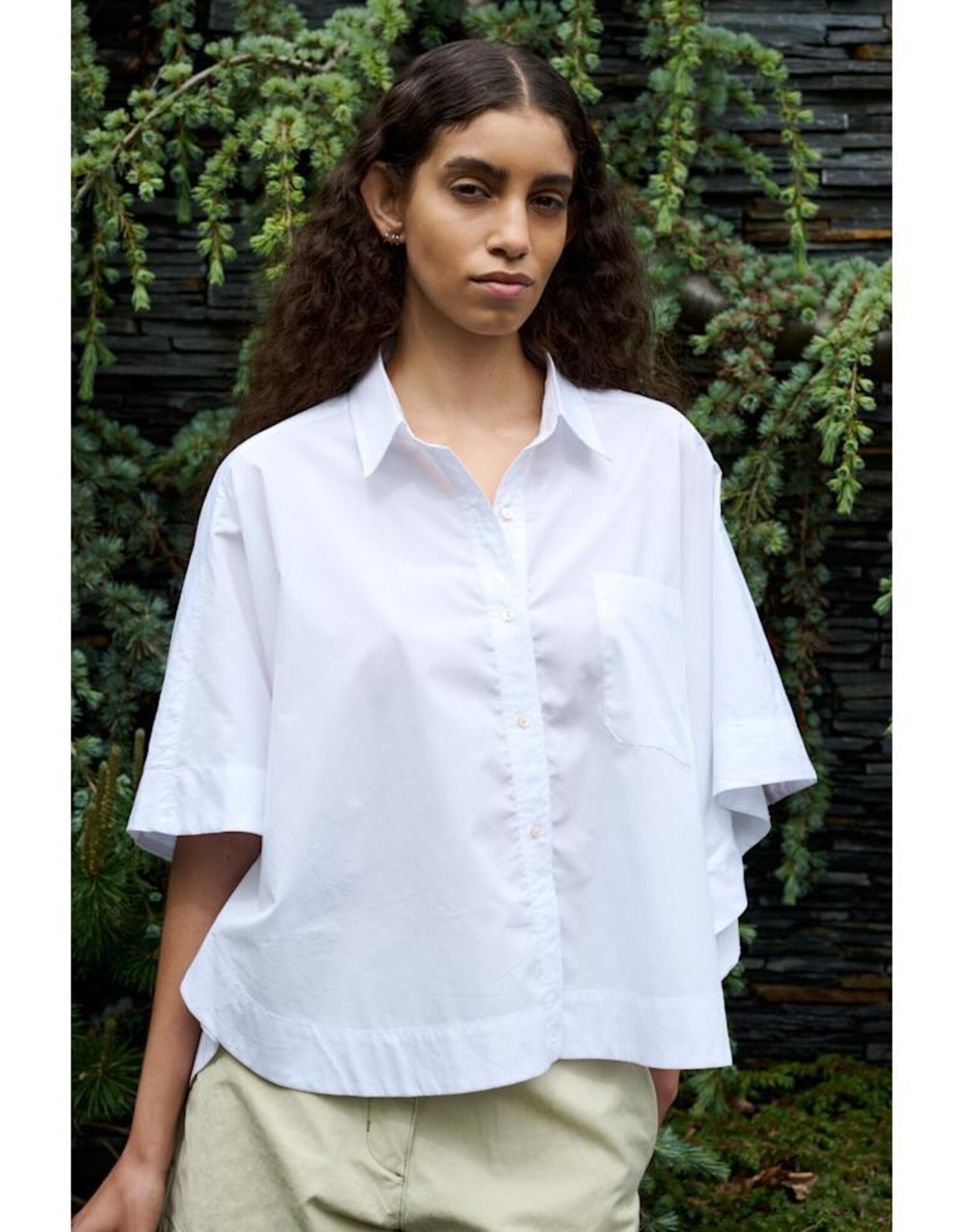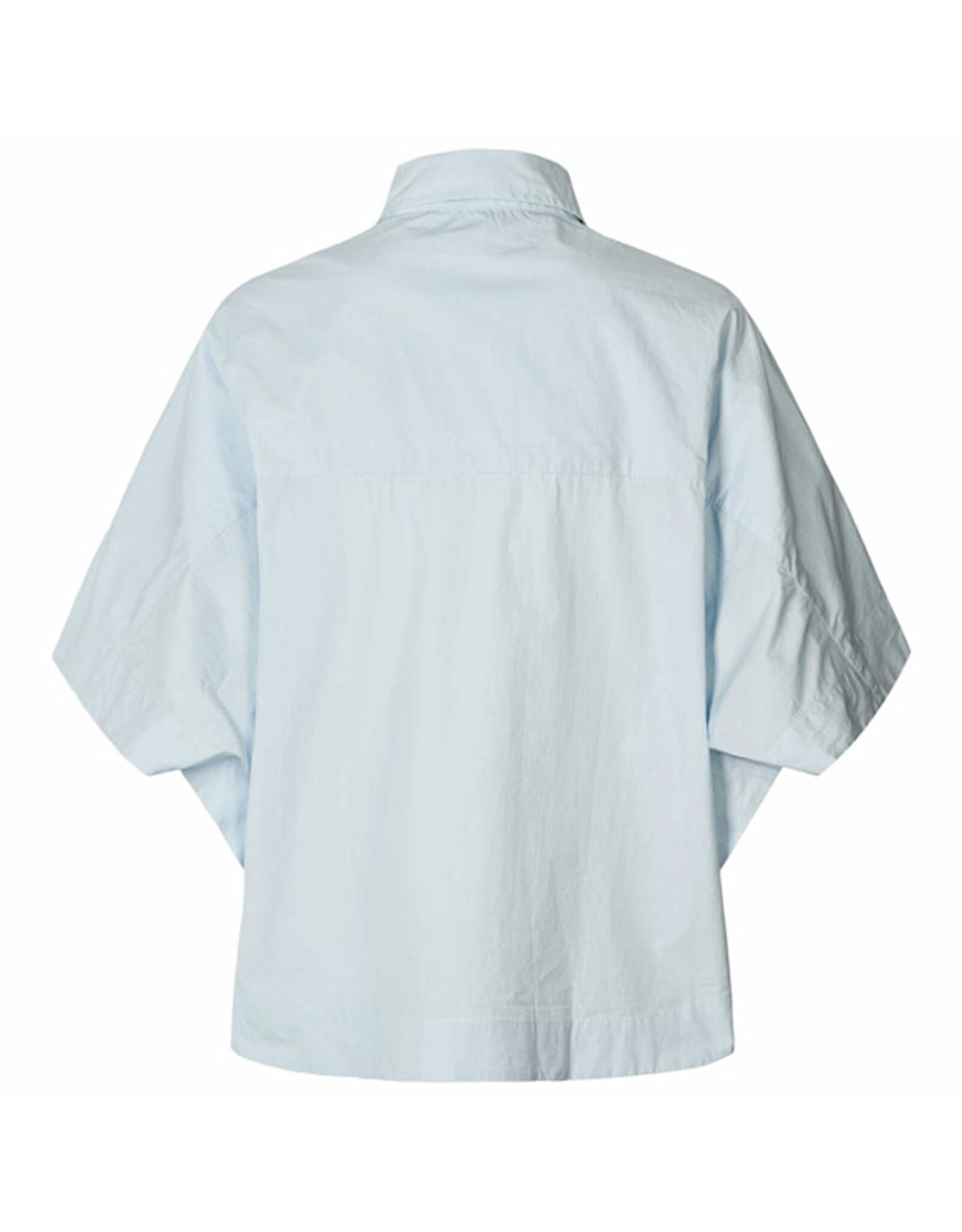 Het overhemd wordt gekenmerkt door een boxy, korte pasvorm met halflange, oversized mouwen, knoopsluiting over de hele lengte, borstzak en een ronde zoom.