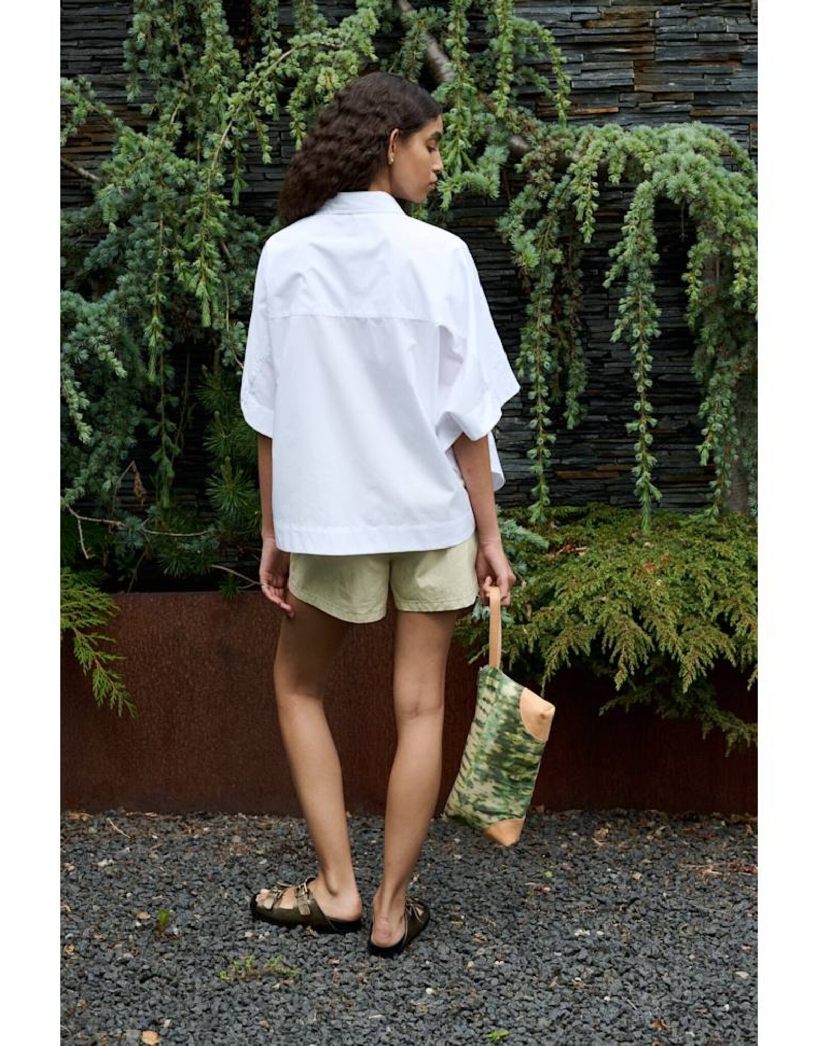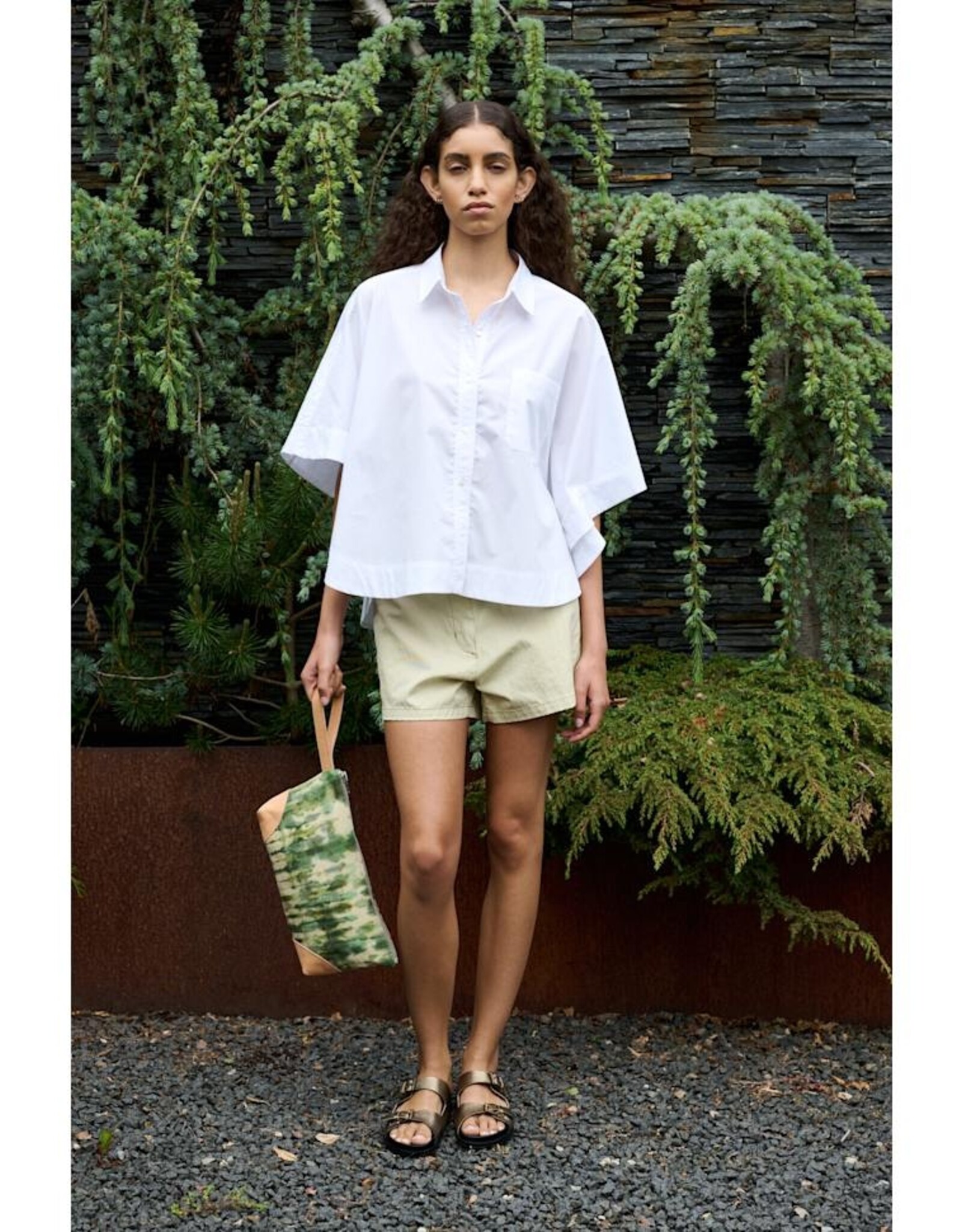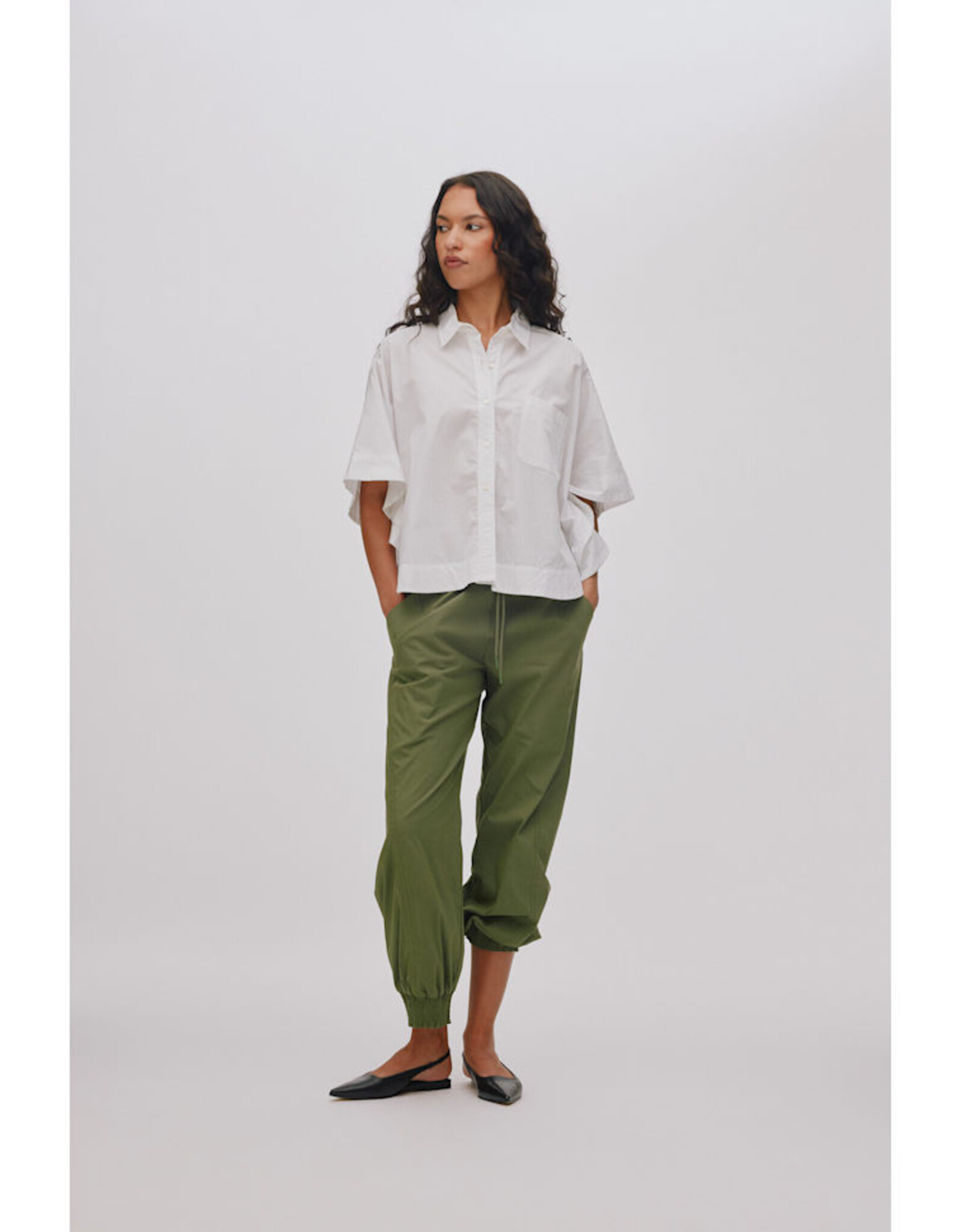 Het overhemd wordt gekenmerkt door een boxy, korte pasvorm met halflange, oversized mouwen, knoopsluiting over de hele lengte, borstzak en een ronde zoom.