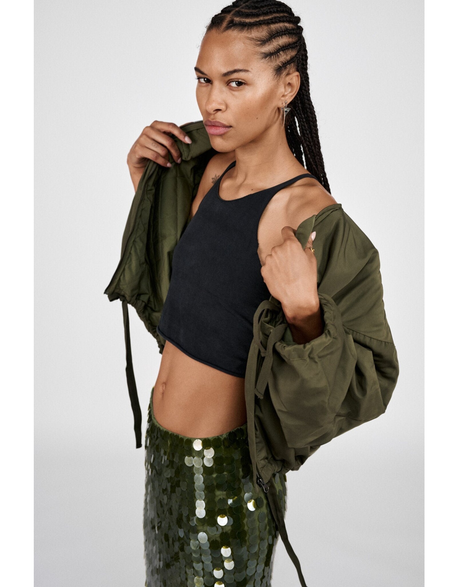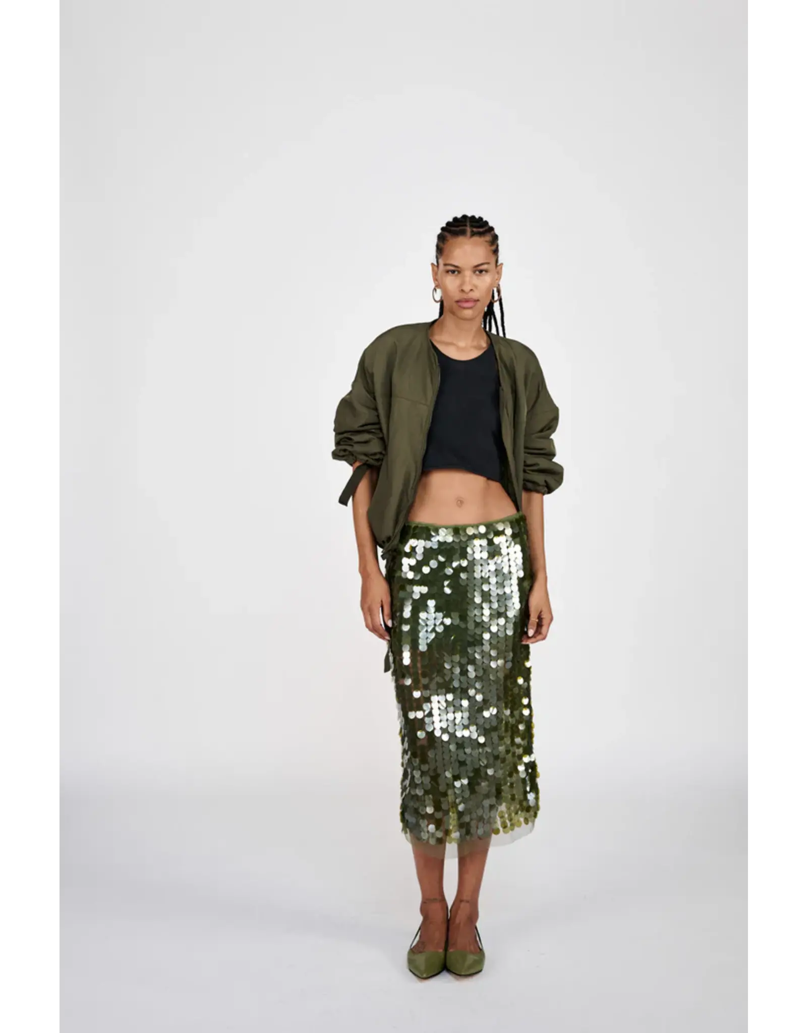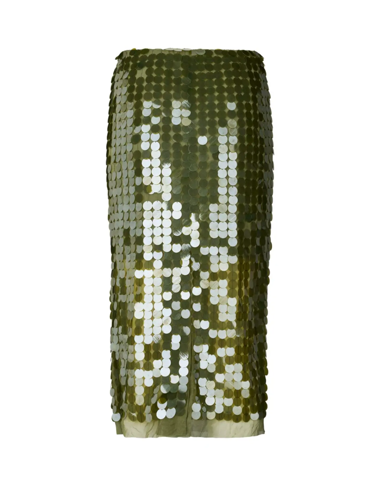 Creëer een glamoureuze look met deze rok versierd met opvallende grote ronde pailletten voor een glanzende, antieke en verfijnde uitstraling. Onder de pailletten bevindt zich een fijne laag licht tule die een romantische en vrouwelijke uitstraling toevoegt. Deze rok is perfect voor feestelijke gelegenheden waarbij je wilt opvallen met een uniek en elegant ontwerp dat een balans vindt tussen gedurfd en delicaat. Maak de look compleet met het bijpassende topje Lilos.