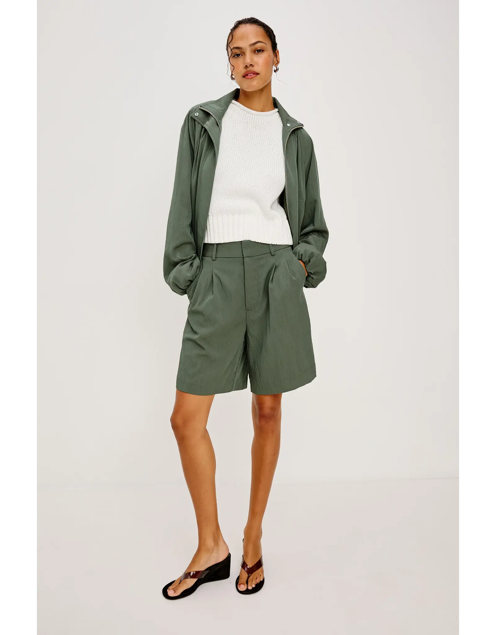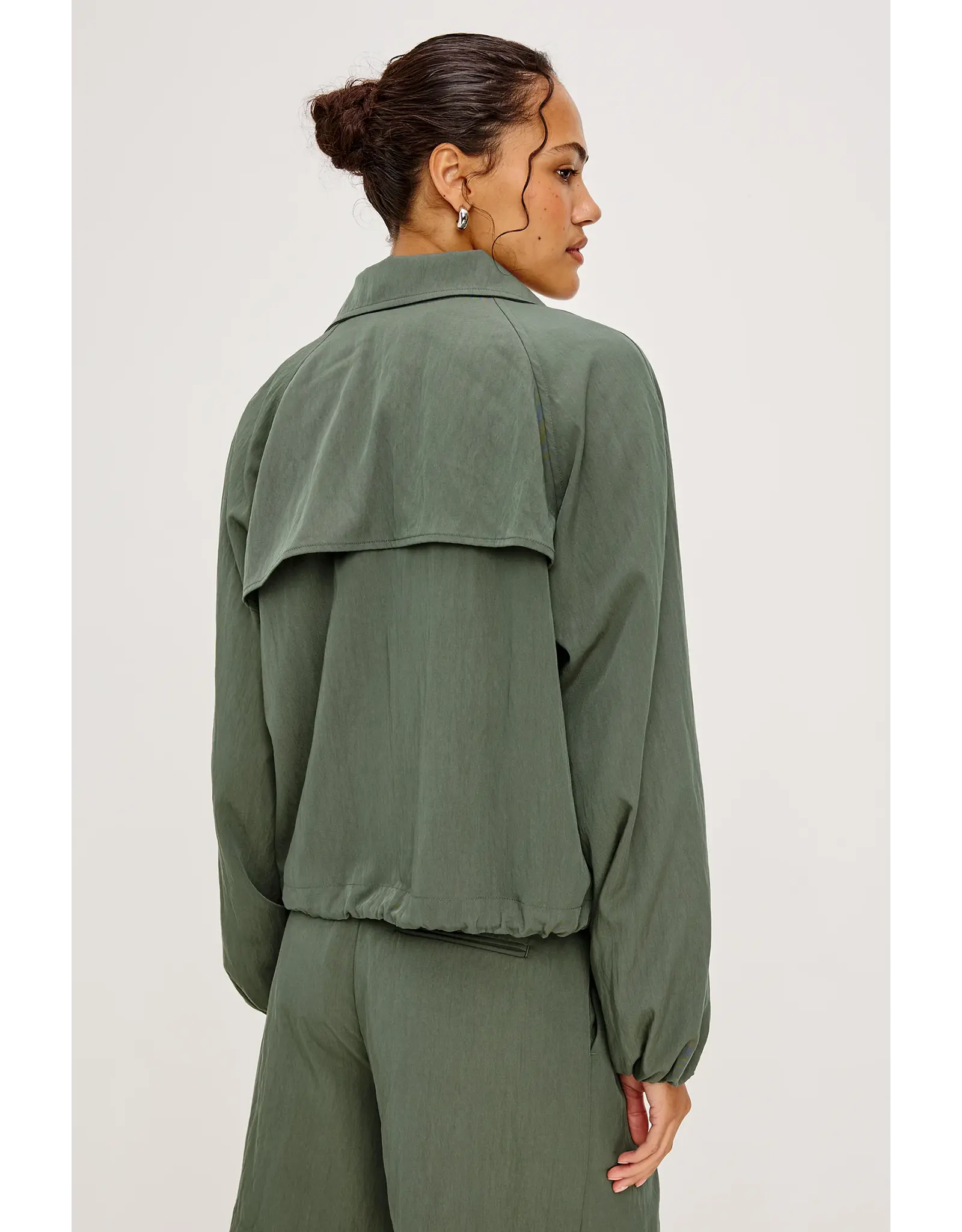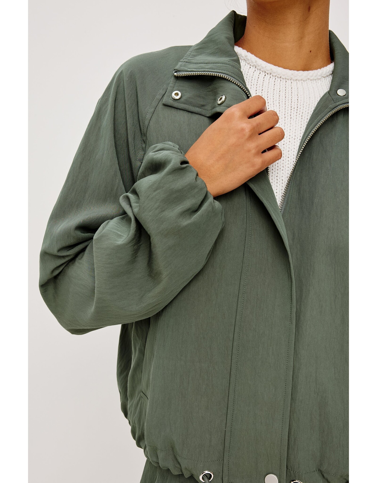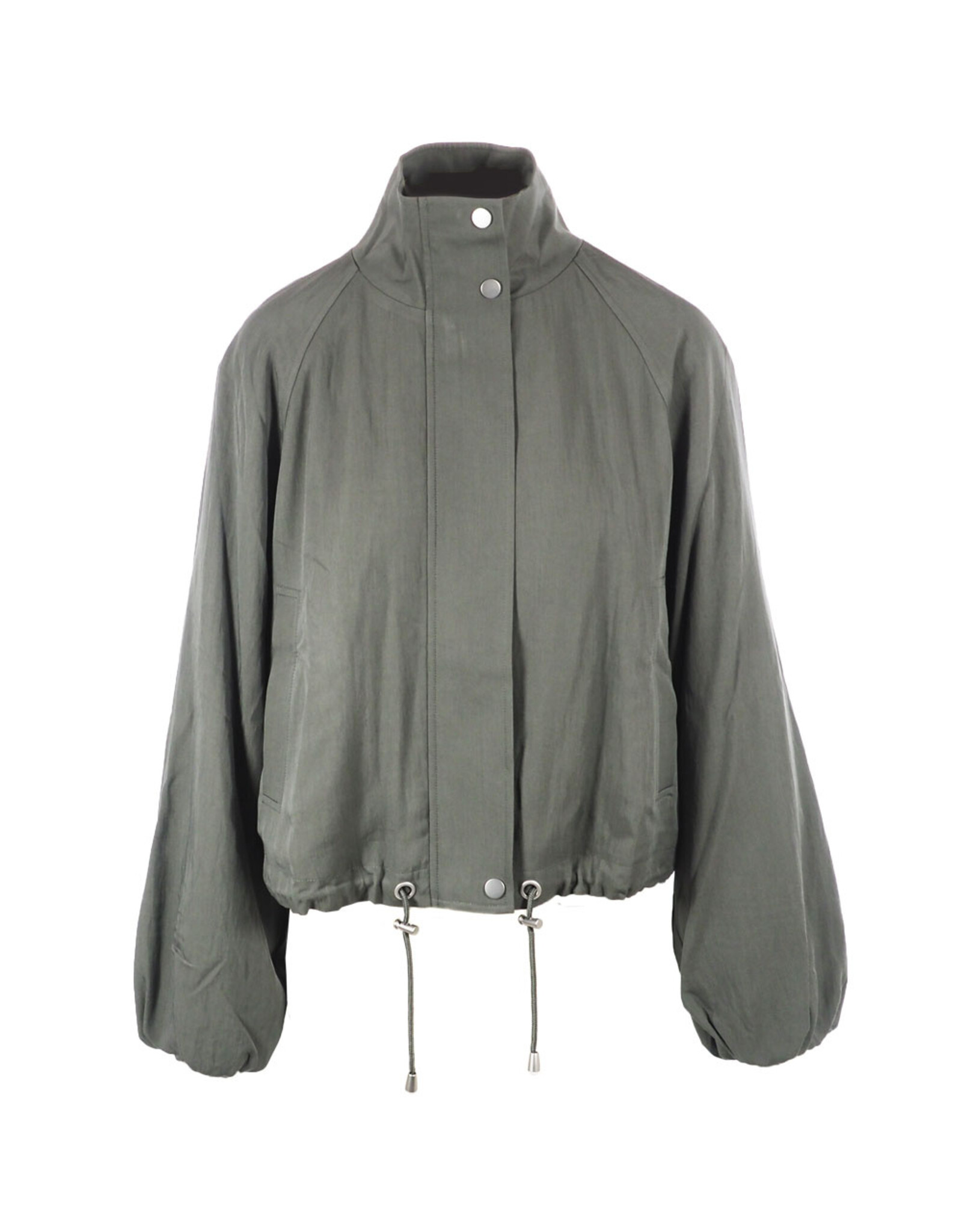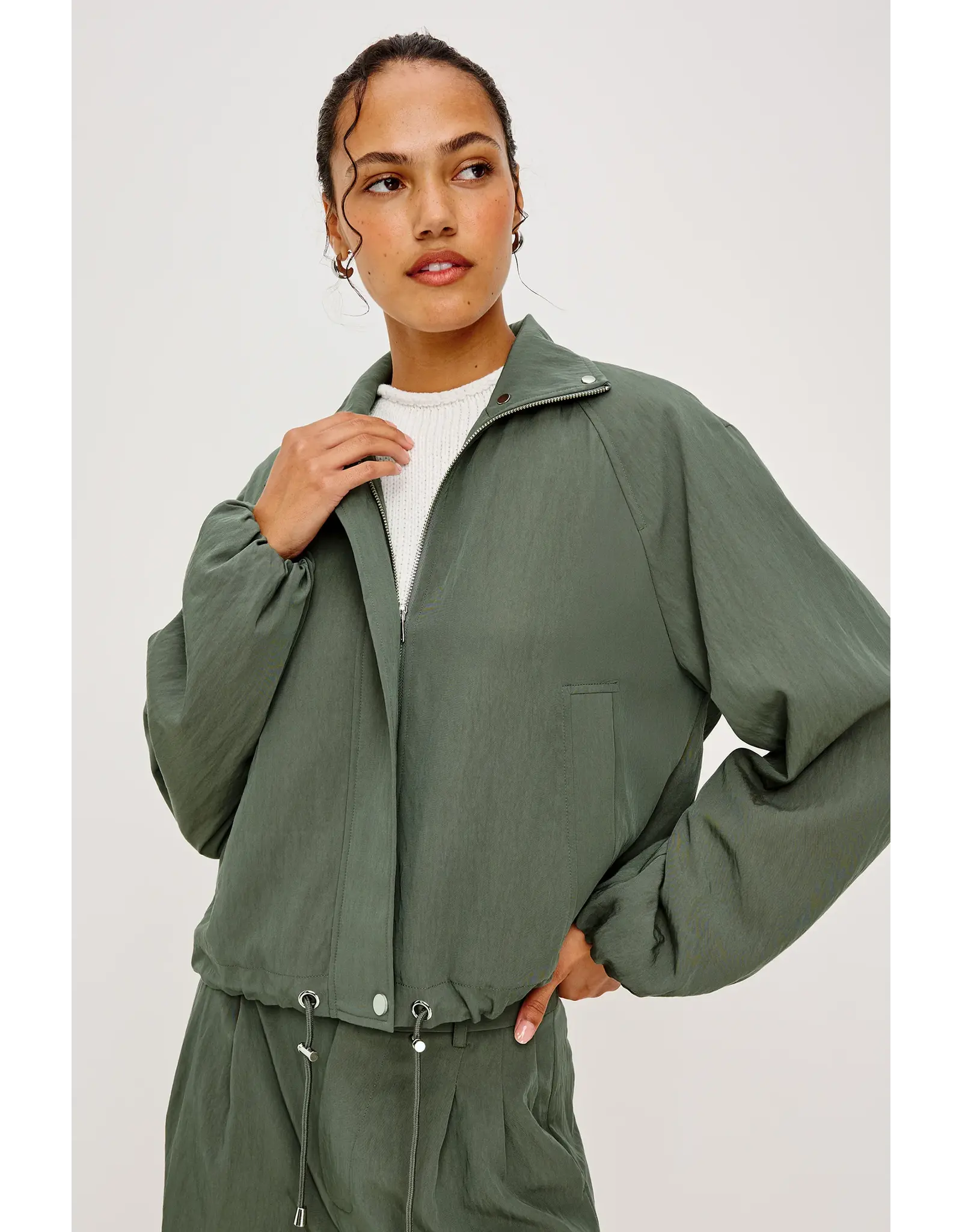 Softly draped, perfectly shaped. The Blake Jacket has a relaxed, oversized fit with a high funnel neck and double-button closures, long dropped-shoulder sleeves with elastic cuffs, and a cropped drawstring hem.