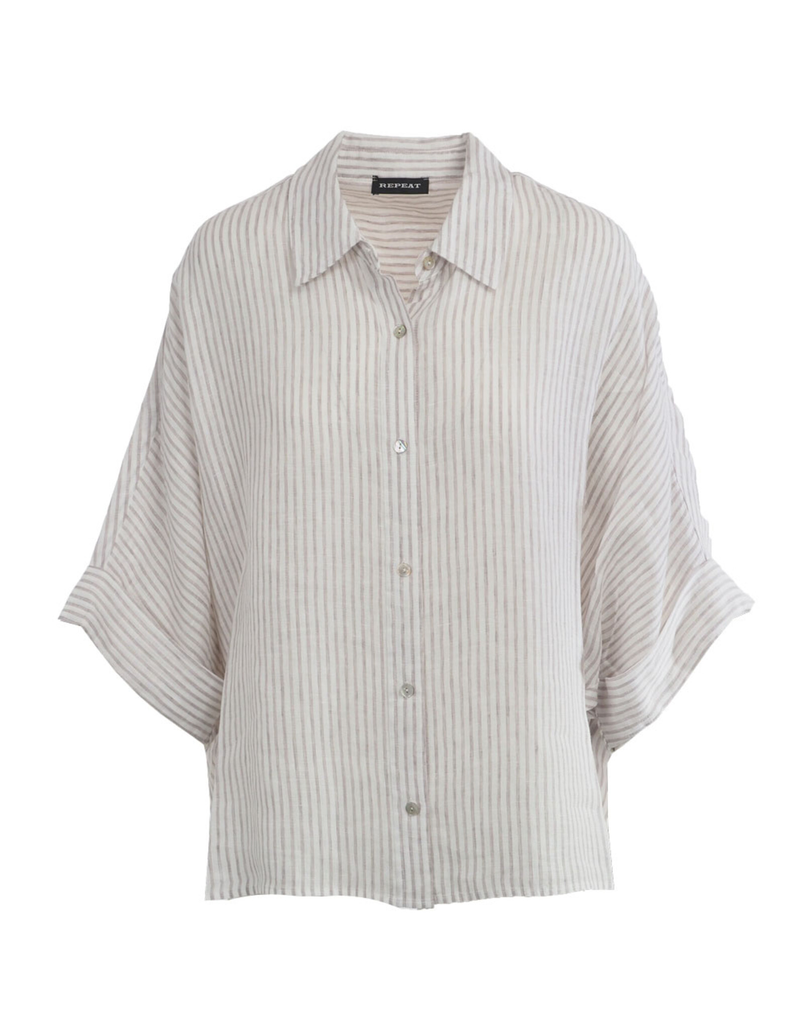 Gemaakt van 100% linnen voor een koele, gestreepte look. Het oversized model met vleermuismouwen en klassieke kraag biedt stijl en comfort. Perfect voor zomerse gelegenheden, gemakkelijk te combineren met REPEAT cashmere.