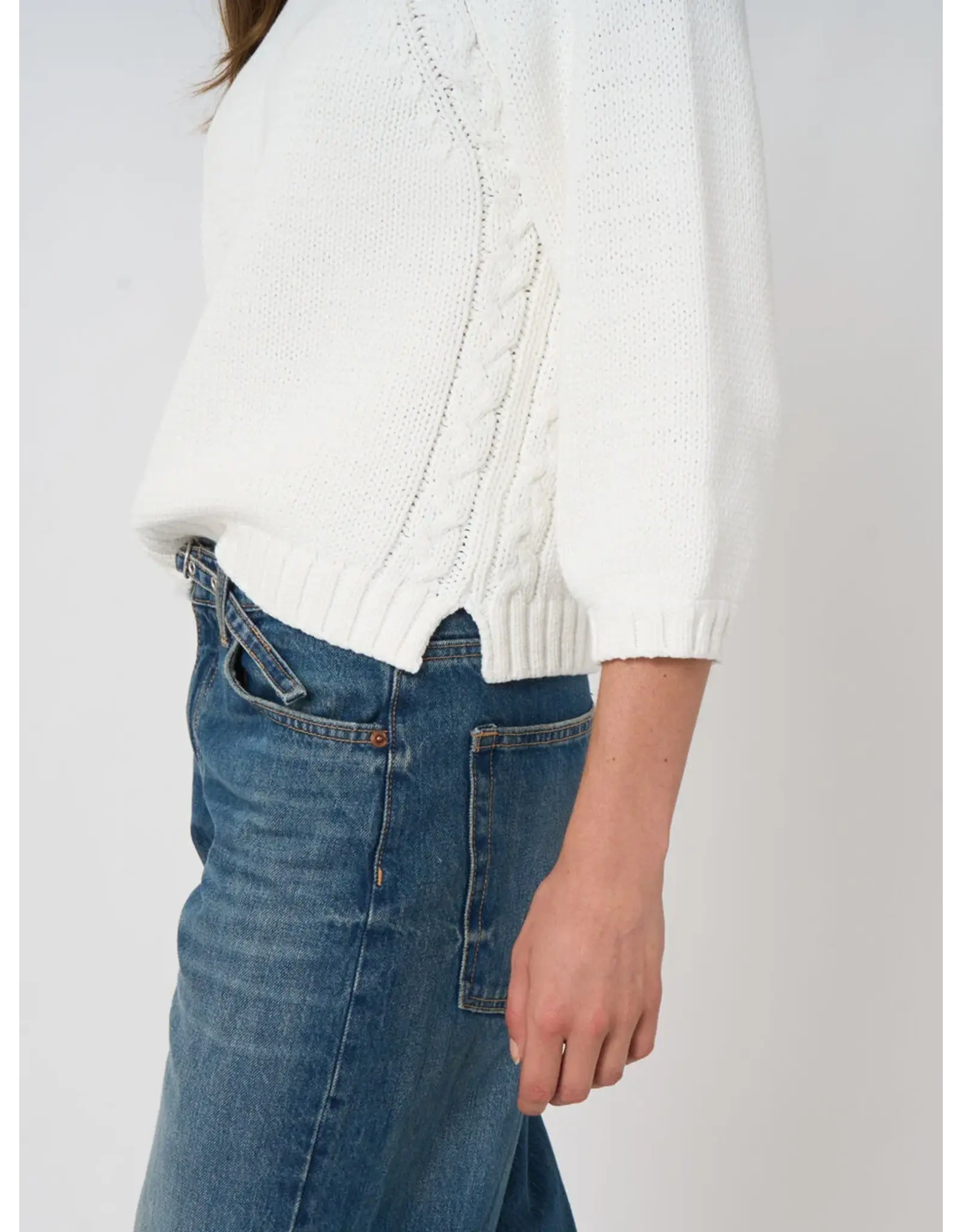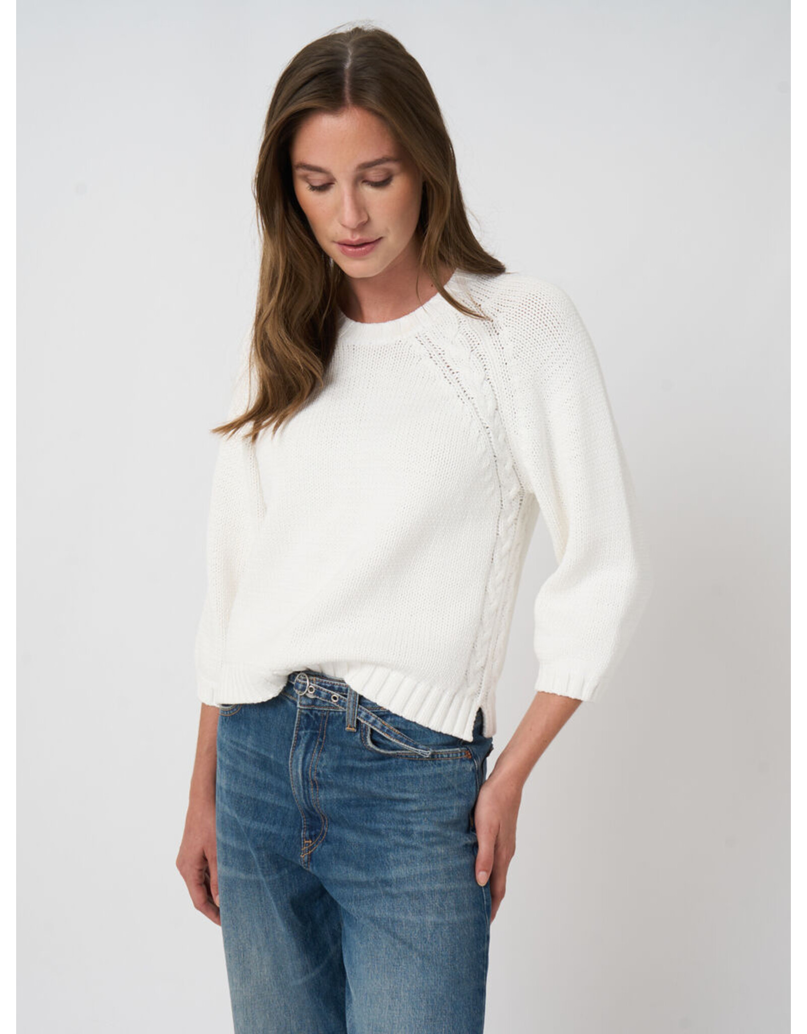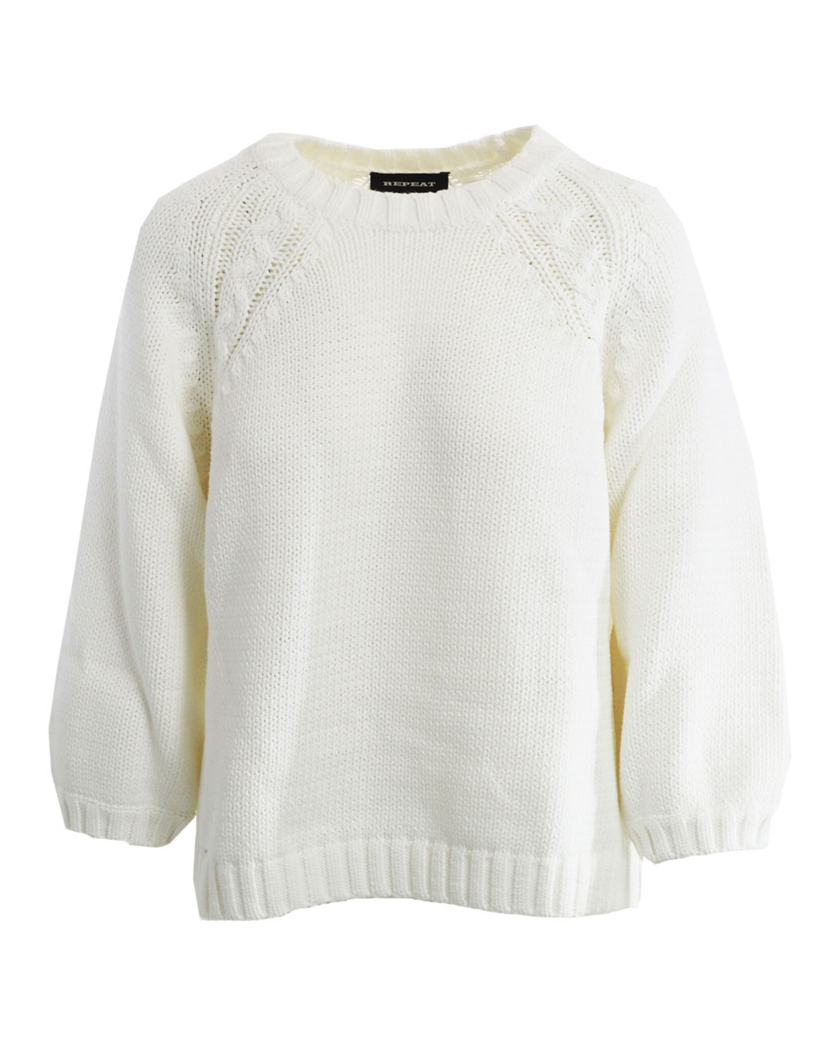 Gespannen uit luchtige katoenmix, voelt deze chunky knit van REPEAT cashmere zacht textuur met een subtiel grofmazige effect en kabelgelijnde raglan naden. Losse regular fit en rechte silhouet met 3/4 mouwen, geribde ronde hals, ribbreisel zoom en zijsplitten. Moeiteloos alledaags draagbaar, ideaal als laag.