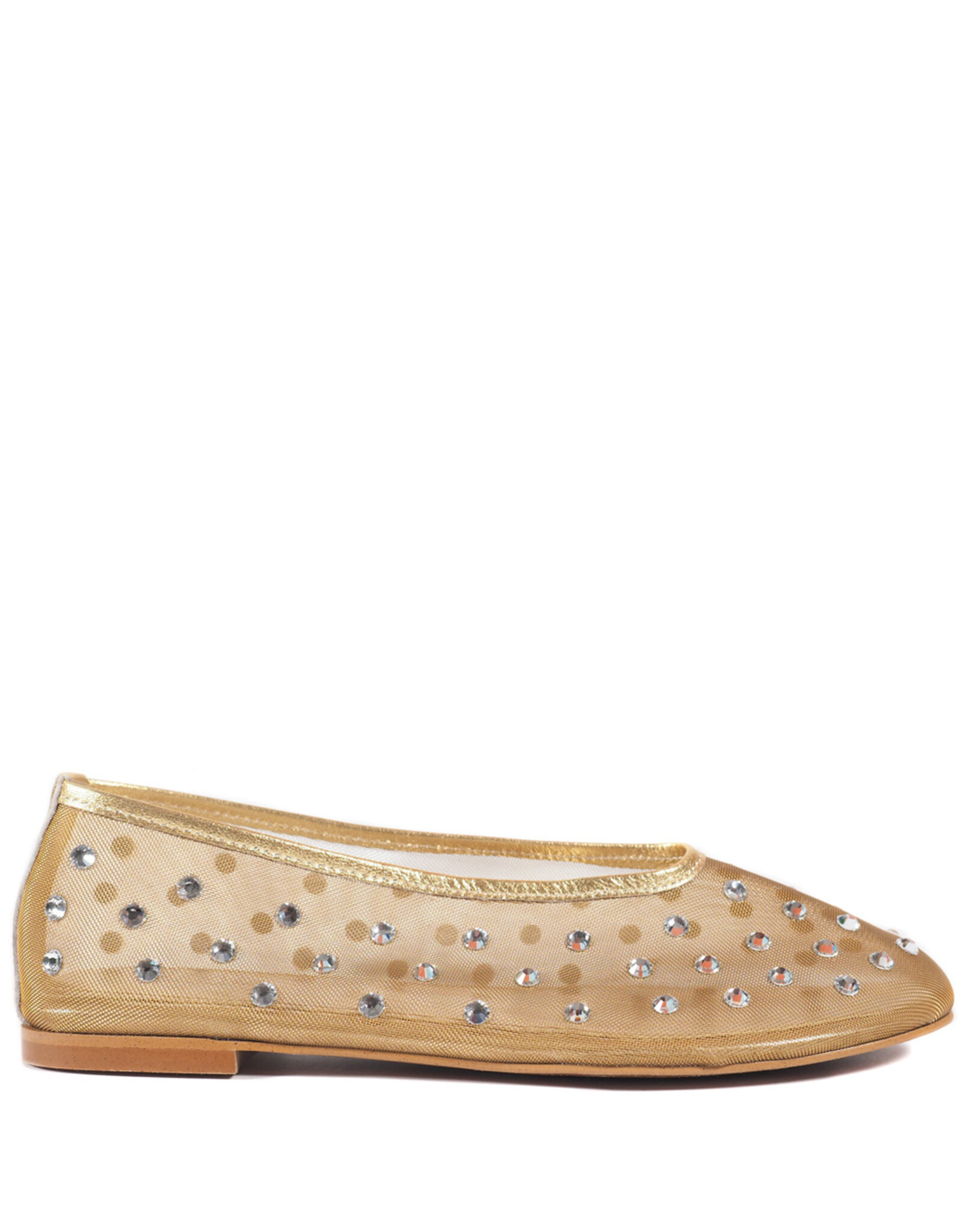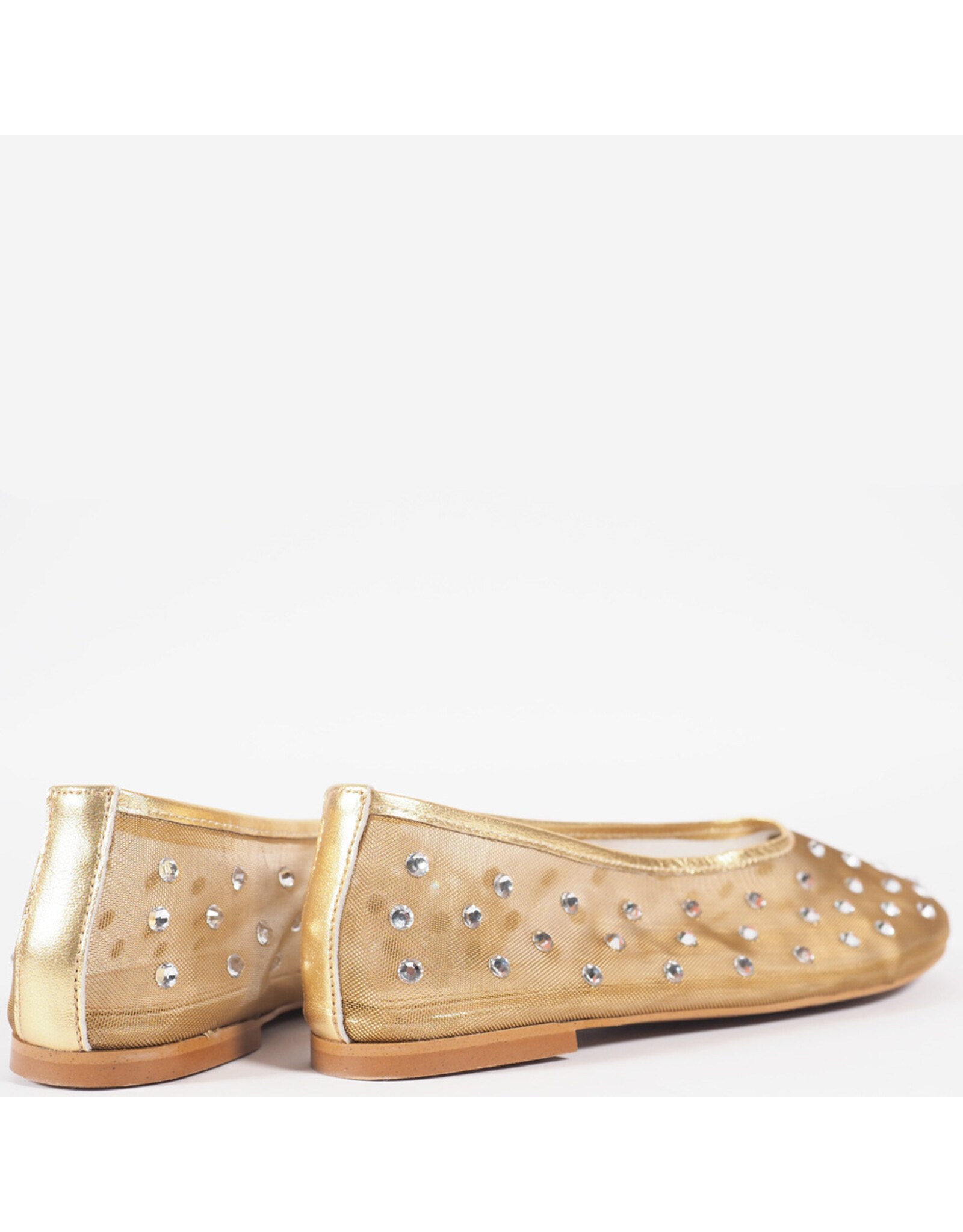 De Sybilla ballerina's zijn een schitterende aanvulling op je garderobe. Gemaakt van delicaat goudkleurig mesh en versierd met sprankelende kristallen, stralen ze elegantie en charme uit. Deze lichte en comfortabele ballerina's zijn perfect om een glamoureuze touch toe te voegen aan zowel casual als formele looks.