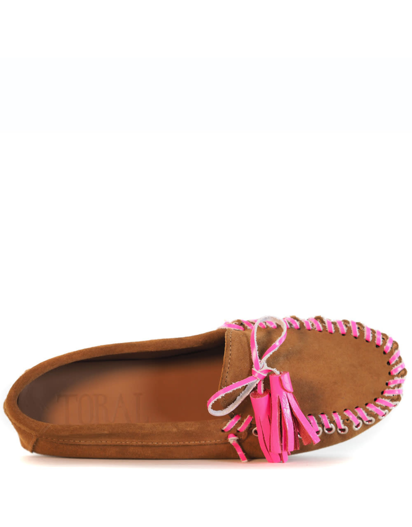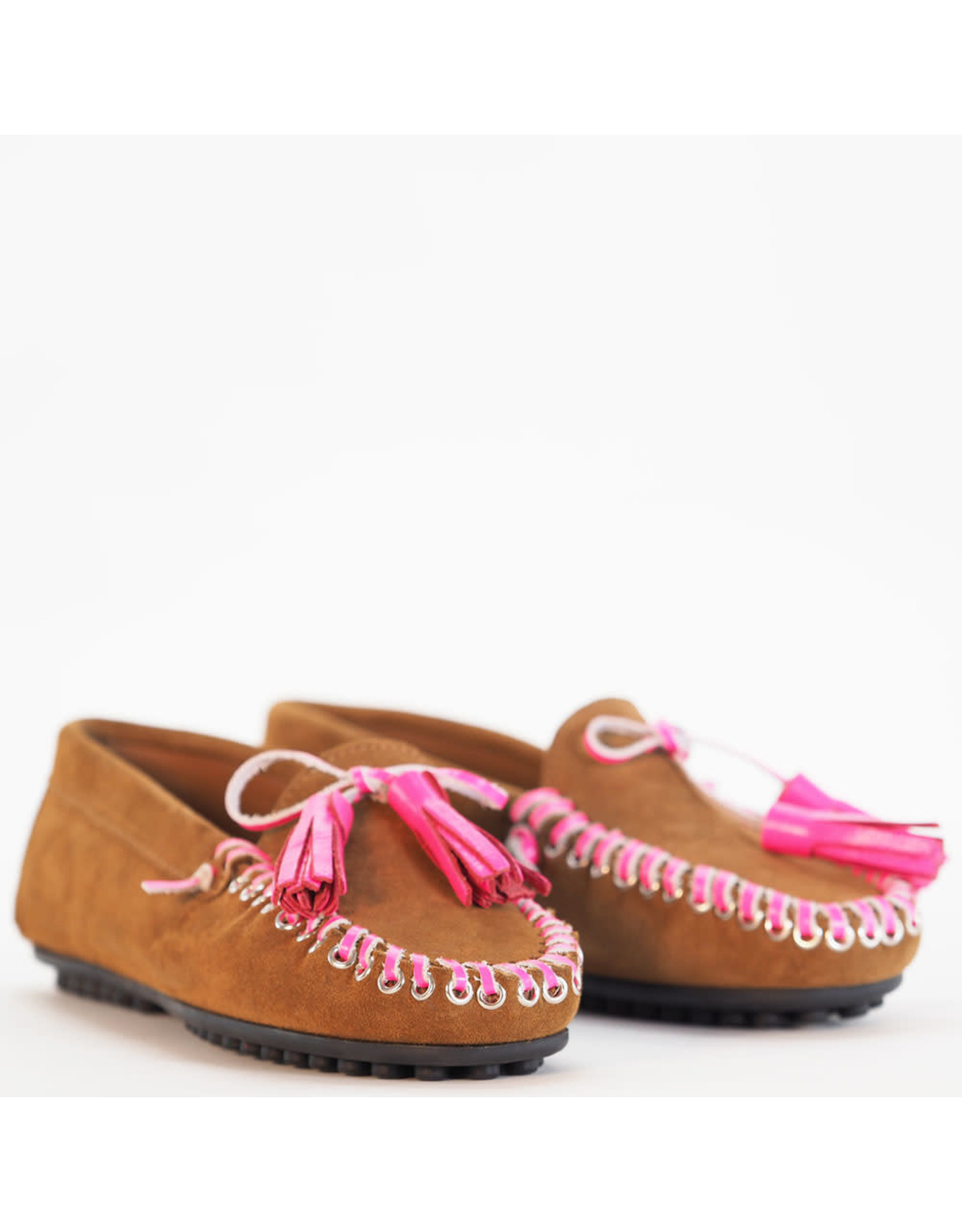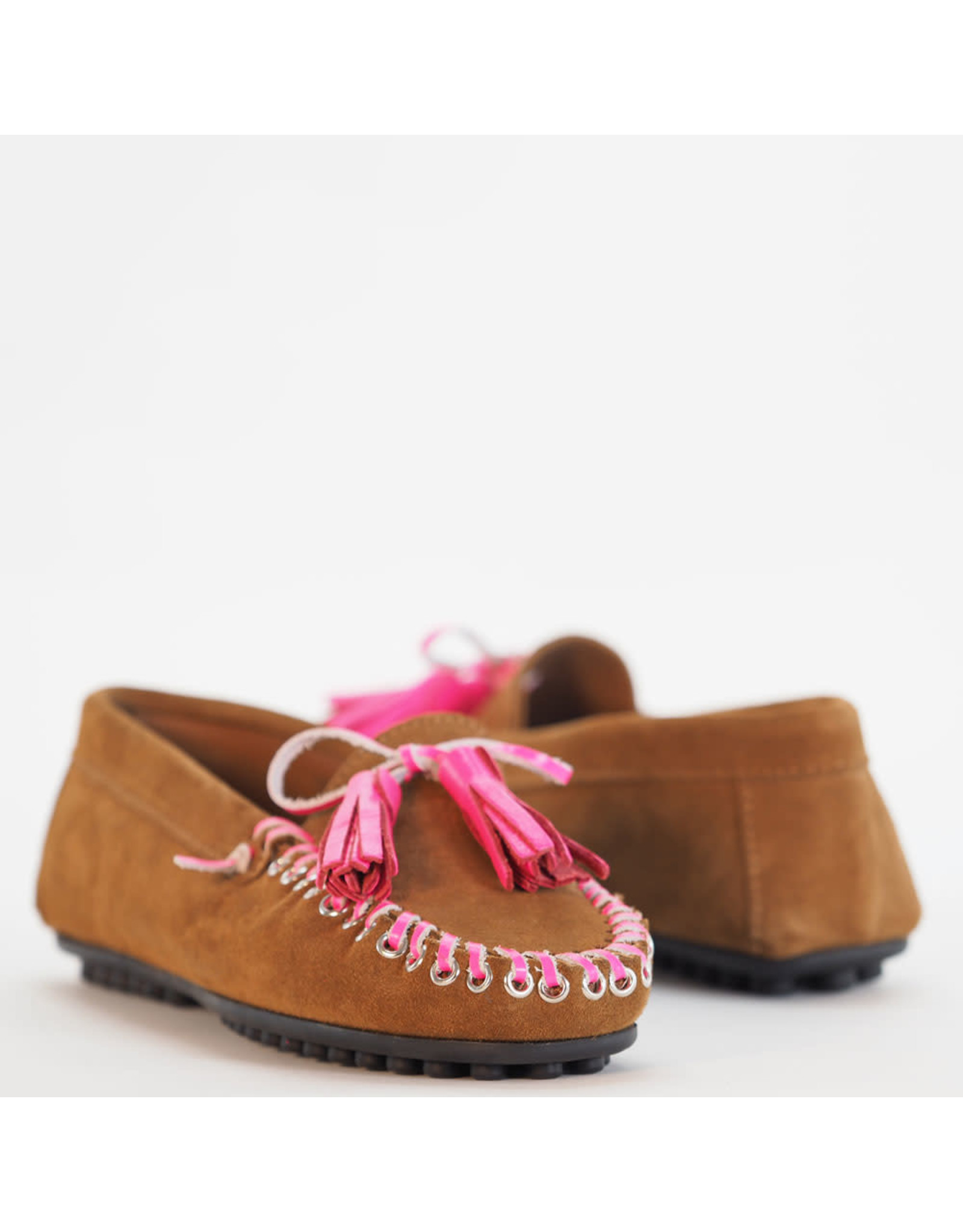 Suede loafers in cognac bruine kleur met kwastje op de voorvoet en gevlochten details in fuchsia roze.