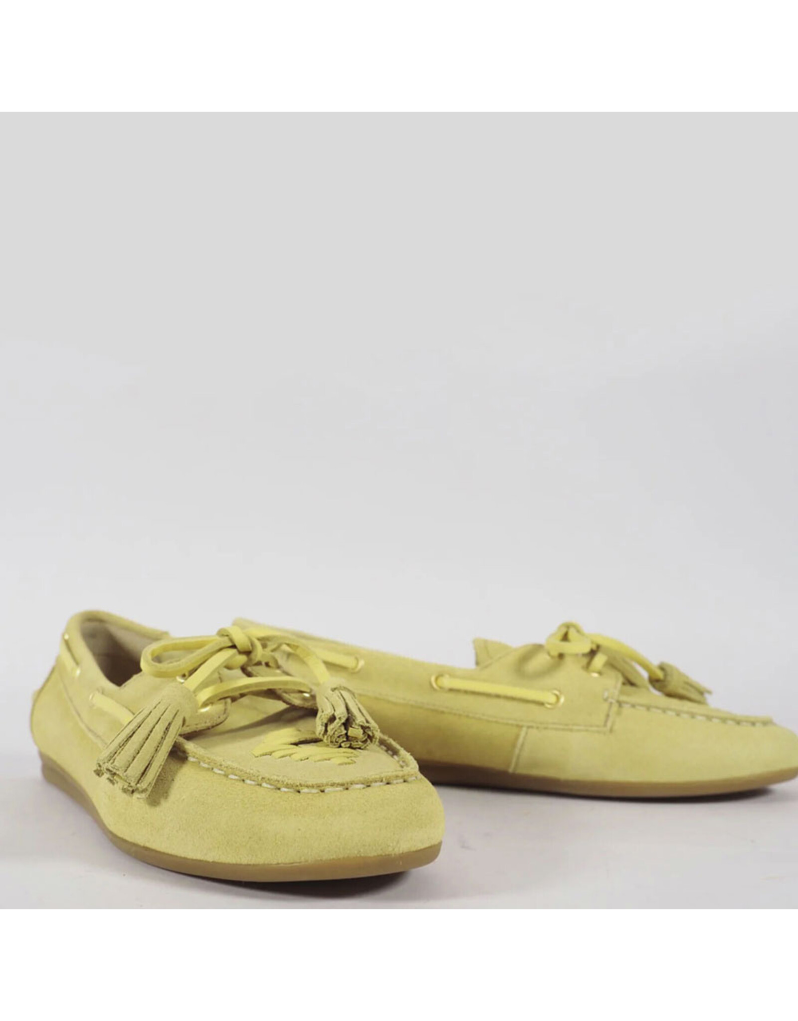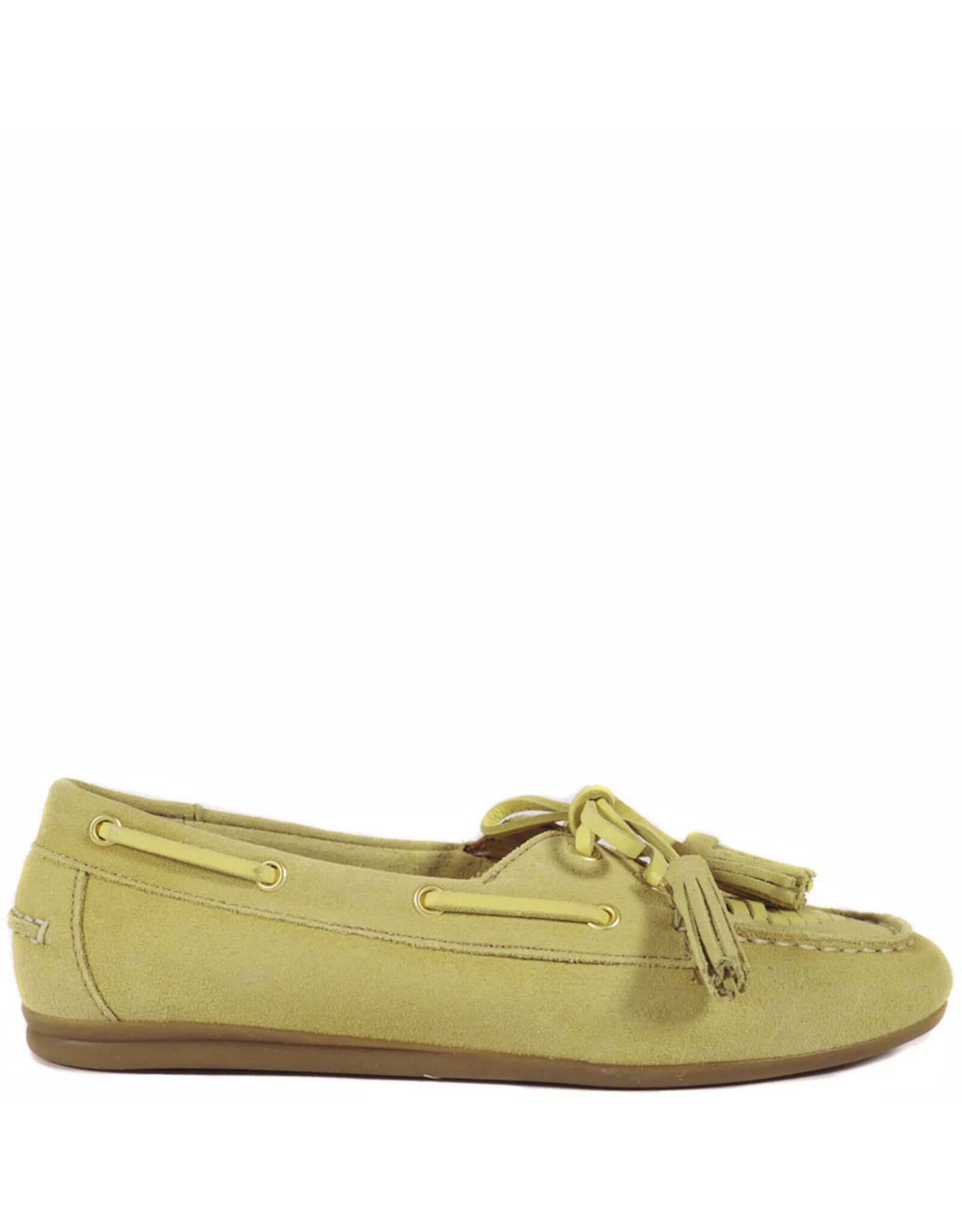 Elegante loafer van Toral, uitgevoerd in zacht suède in een warme gold paglia (geel) tint. Dit tijdloze model heeft een klassieke mocassin-look met verfijnde details zoals de decoratieve vetersluiting en speelse franjes op de wreef.