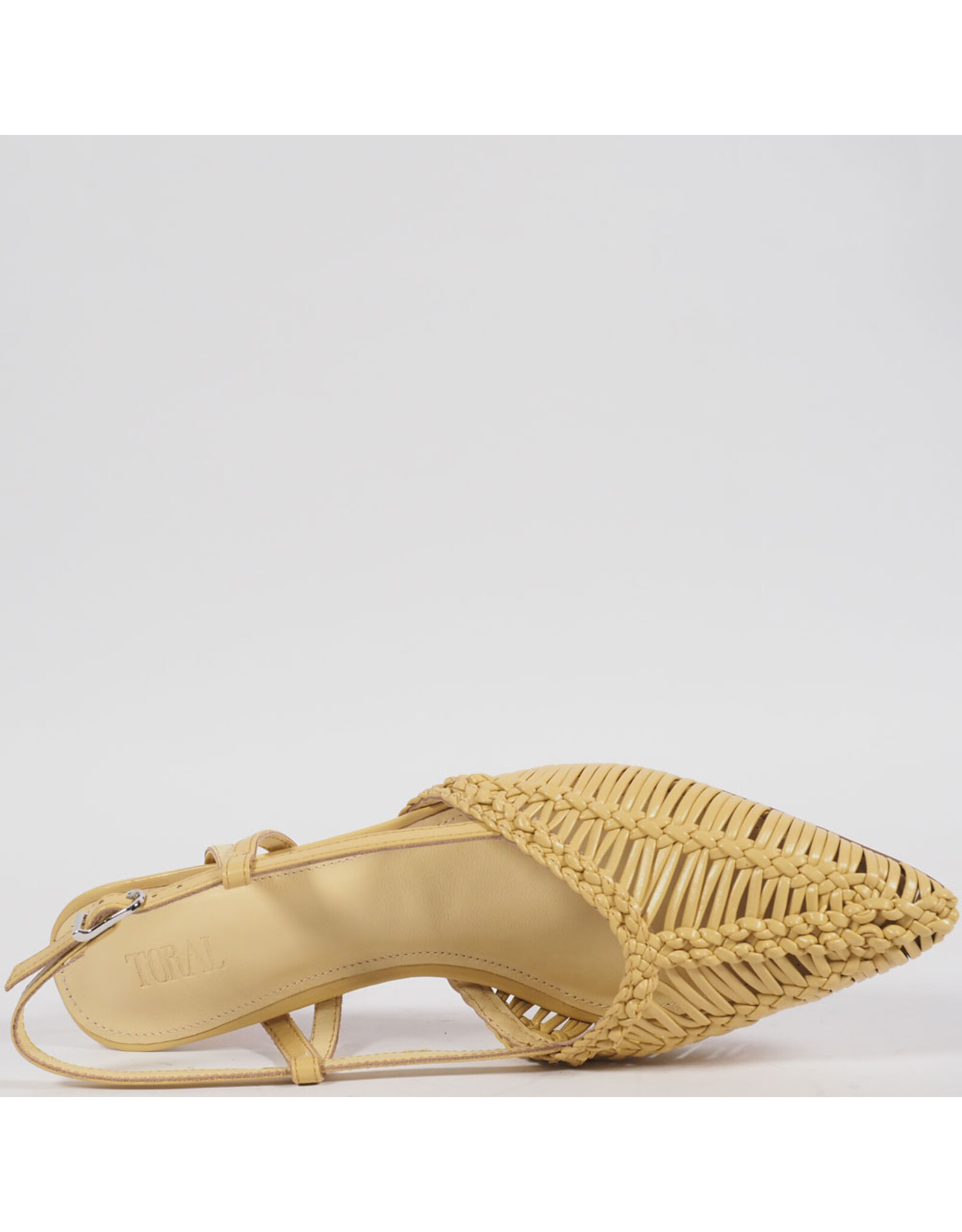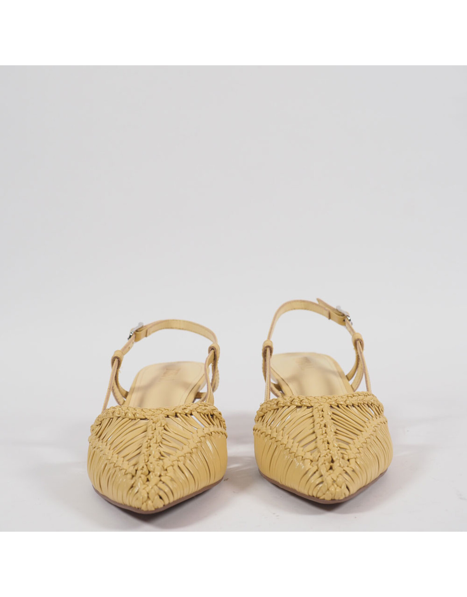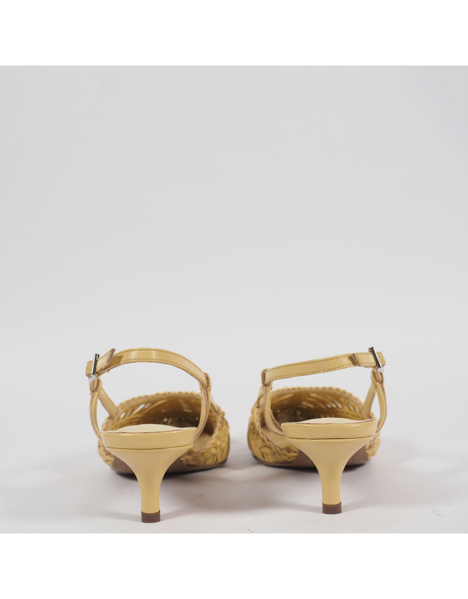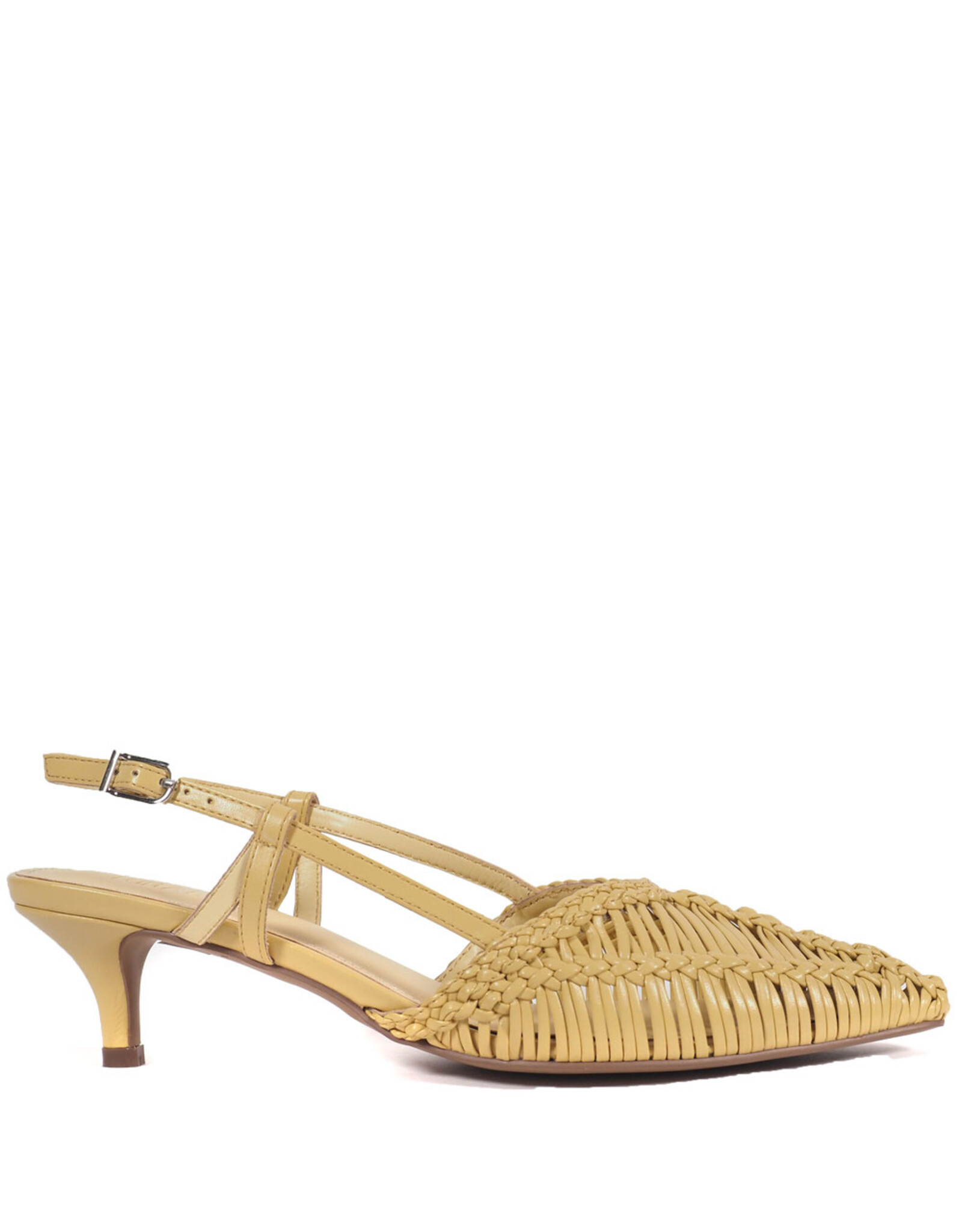 The KATHRYN slingback in yellow leather brings a brighter expression to its woven construction. The textured upper creates depth across the softly pointed toe, while the fine straps and slim mid heel maintain a light, balanced silhouette. A defined design that feels fresh and precise without excess.